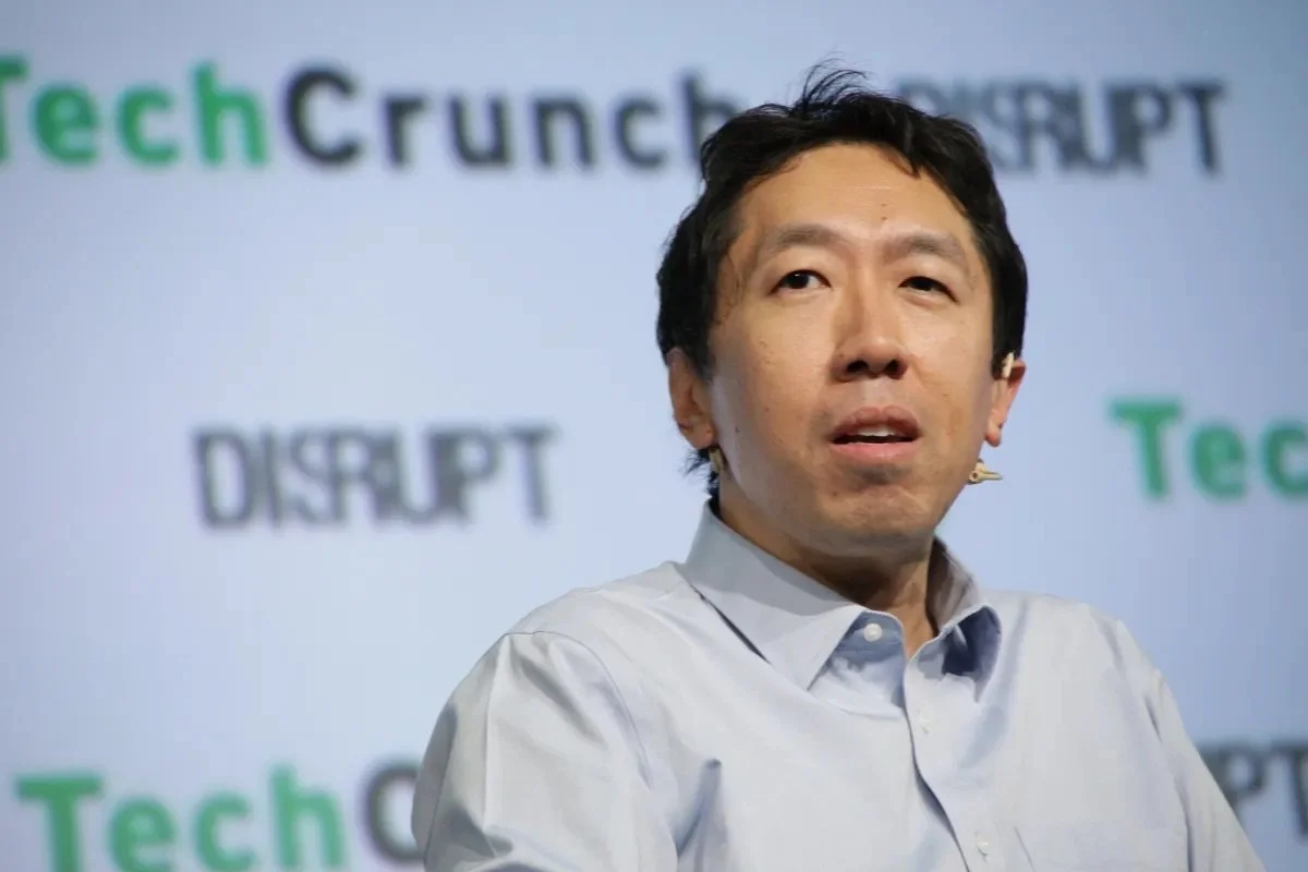 Person in photo is Andrew Ng. He has short black hair, is wearing a light gray shirt speaking in front of a screen displaying the words TechCrunch, DISRUPT, and other partially visible text.